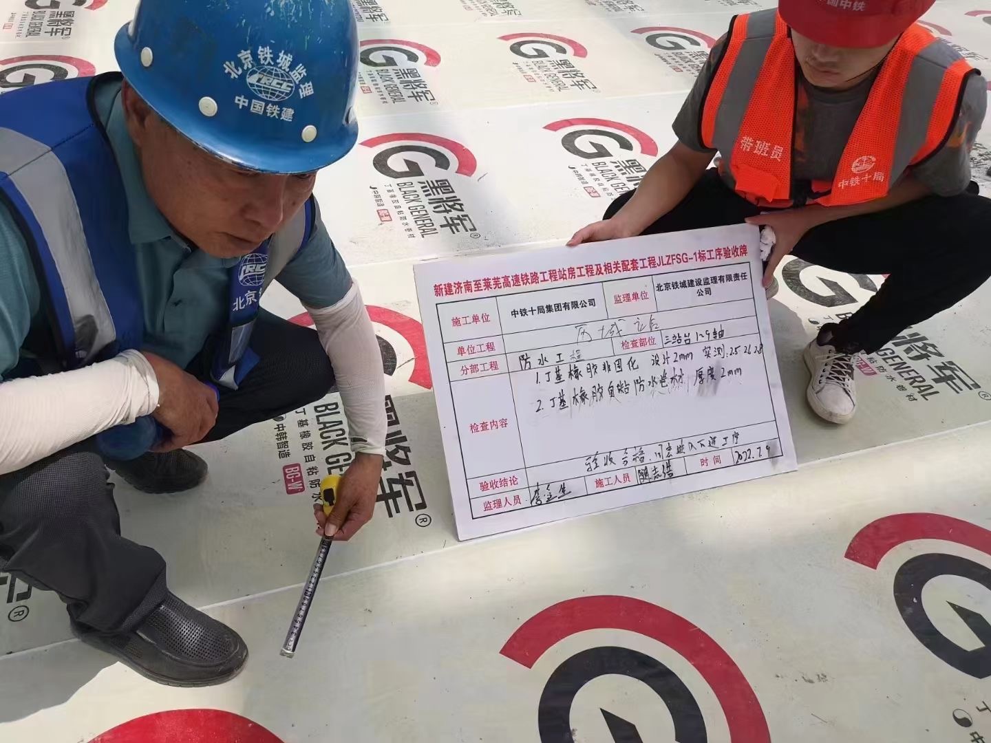 2021年11月份,歷城站(更名前為港溝站)的主體結(jié)構(gòu)底板防水工程,總包單位就因?yàn)榭粗辛撕趯④姰a(chǎn)品的寬幅耐溫性,選用了黑將軍BG-Y丁基橡膠高分子自粘膠膜防水卷材,九鼎宏泰交付了滿意的答卷。